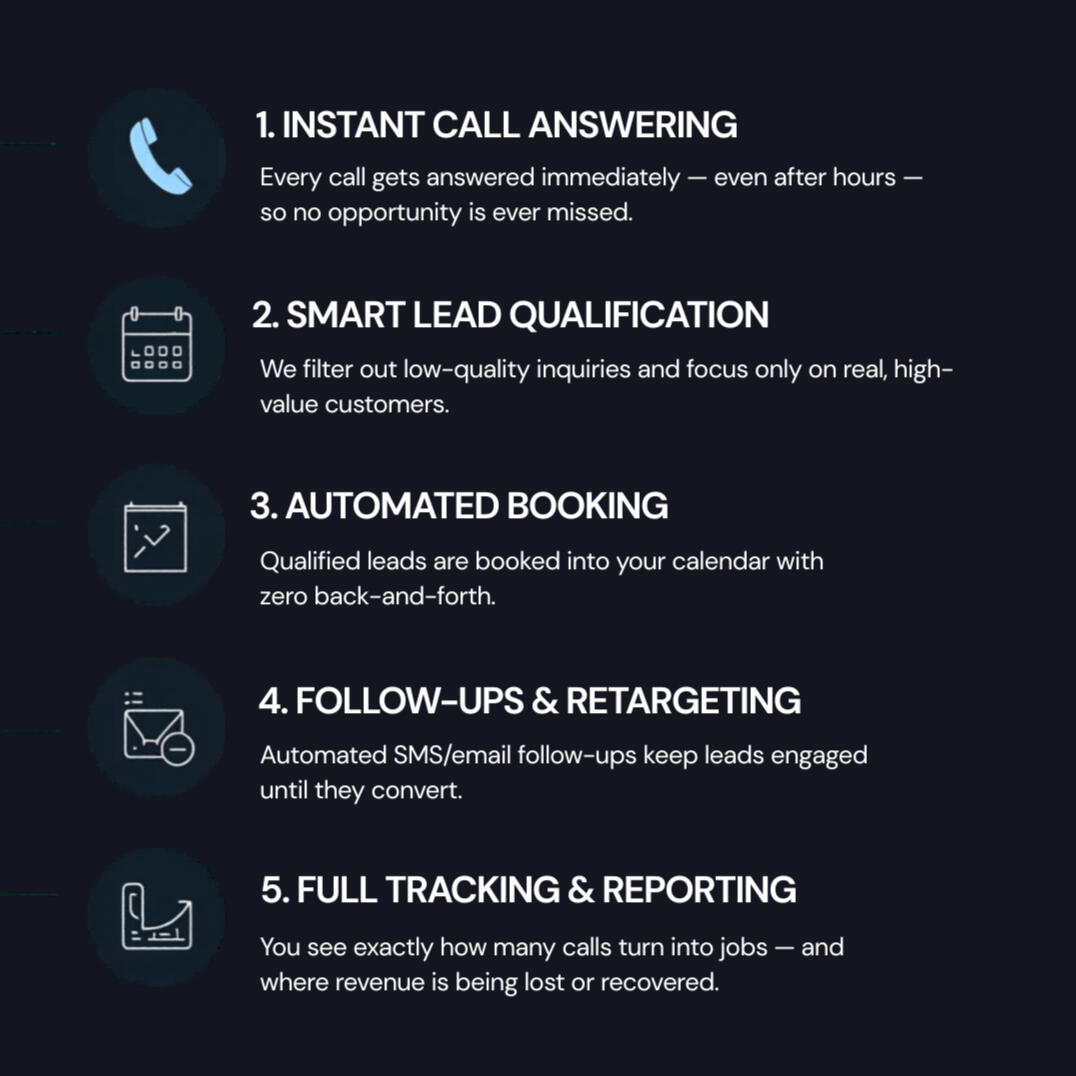 Capture every call, qualify serious leads, and book jobs automatically with our fully automated AI call and booking system — day or night.